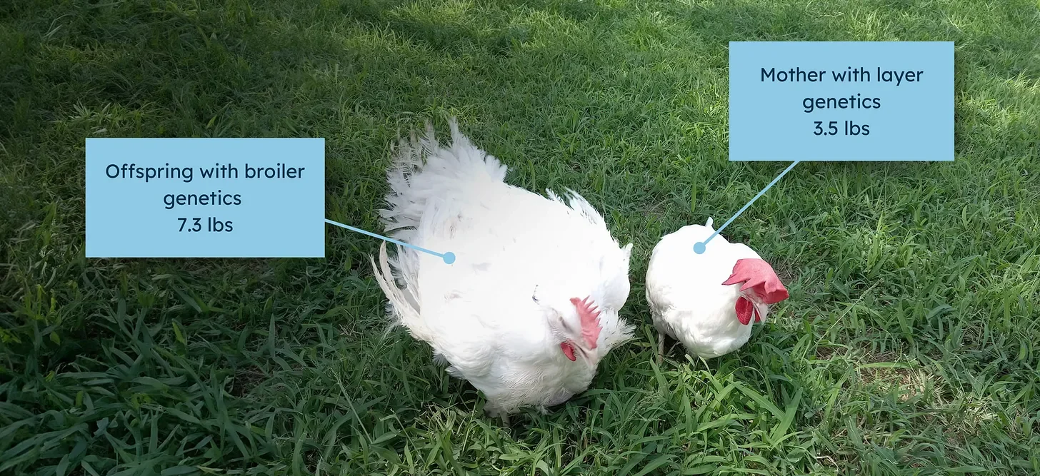 A proof of concept from the LLB project. On the right is a sterile surrogate hen, whose offspring is over twice as big as she is.