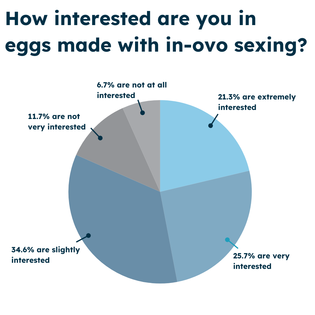 The data from our American Consumer Survey supports the idea that consumers will react positively towards producers who adopt the technology. After being informed about chick culling, 82% of the consumers surveyed express interest in eggs produced with in-ovo sexing technology, including around 50% of consumers who are “very” or “extremely interested. Overall, this data indicates that rather than kneejerk outrage to learning about the challenge of chick culling, consumers will feel more connected with brands and retailers that have taken the initiative to find a technological solution to the problem. Rather than consumer backlash, all the data we’ve seen points to eager enthusiasm.
