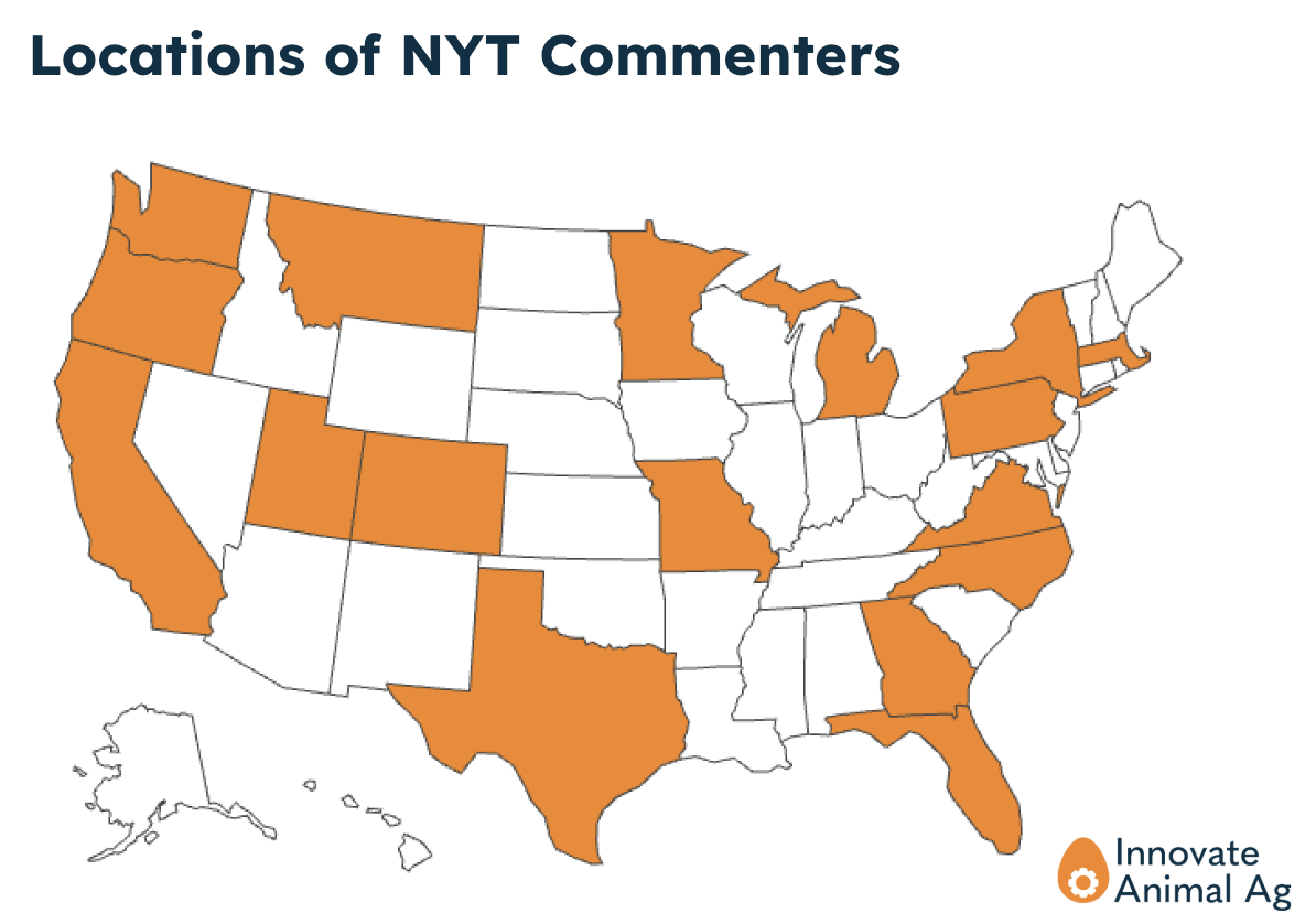 The 173 unique commentators came from 17 states, providing a diverse set of viewpoints from across American society. The commenters were 60% urban, 25% suburban, and 15% rural based on their provided location data. 7% of all commenters reported growing up on a farm or having worked on a commercial-farm at some point in their life.