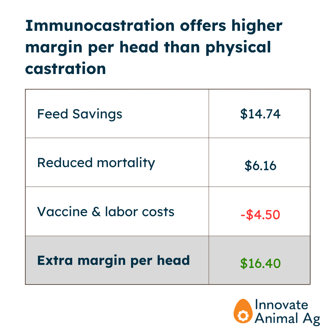 Based on published literature and field data, immunocastration increases profitability per pig by roughly $16 for a typical producer, with a broader range depending on the degree of vertical integration and local conditions. This includes substantial improvements in feed conversion rates (studies show an improvement of 15-25% compared to physically castrated pigs), as well as mortality (at least -2 percentage points in mortality from wean to finish). The $16 figure also doesn't account for additional upside from heavier finisher carcasses, lower antibiotic use, and carbon emissions reductions from improved feed efficiency.